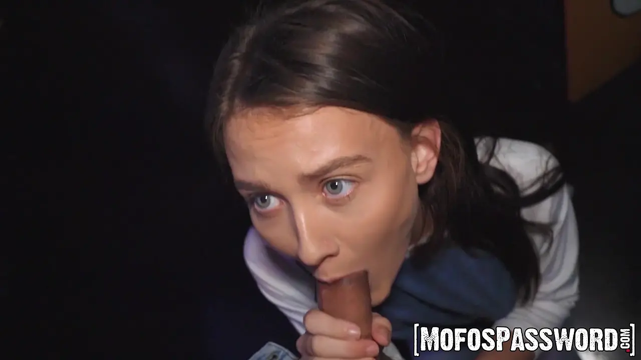Petite teen Veronica Church blows and rides big dick in public. She deep throats his cock before getting on top for some rough cowgirl action. He pounds her hard in missionary and reverse cowgirl, leaving her with a creampie.